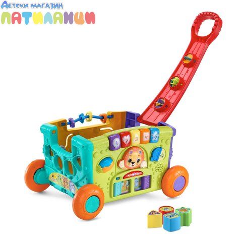 • Играчка за бутане – стабилна конструкция и удобна дръжка за опора при прохождане