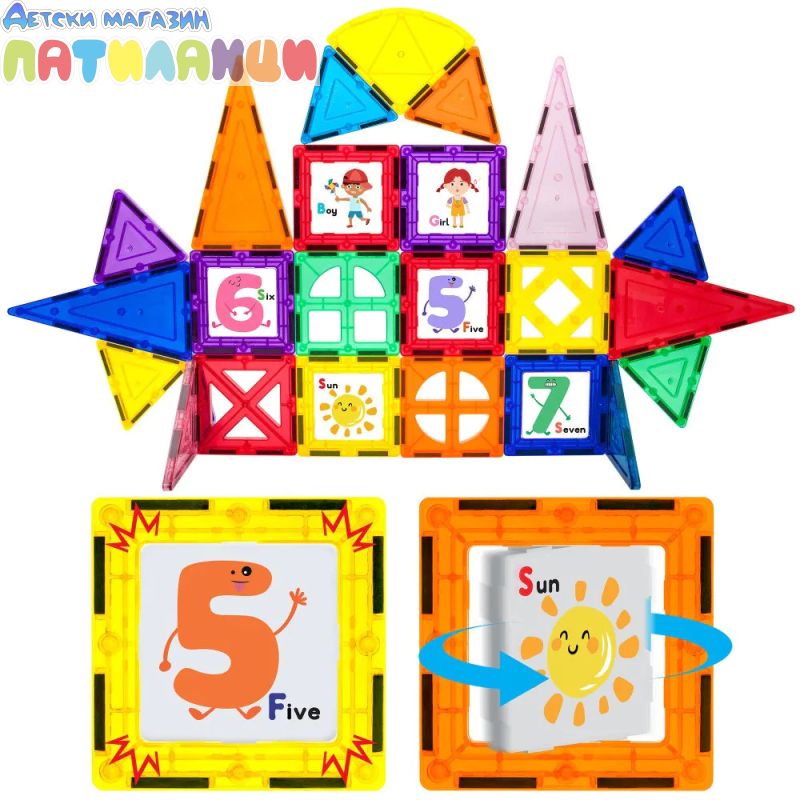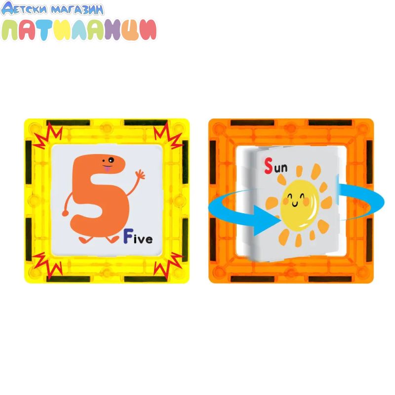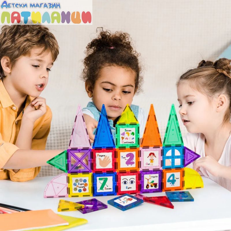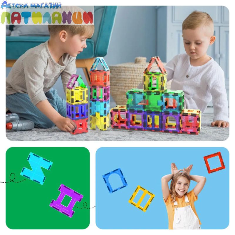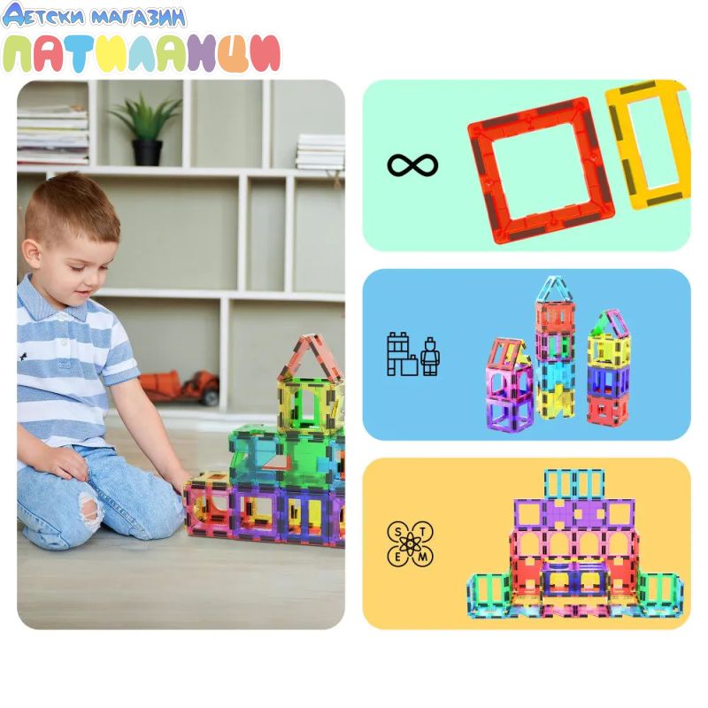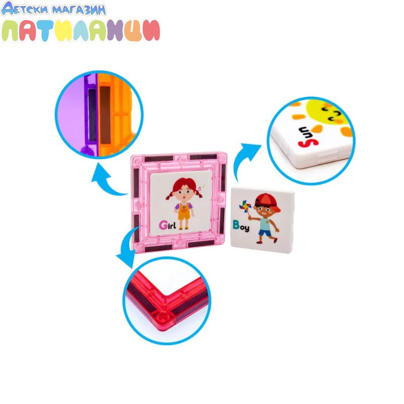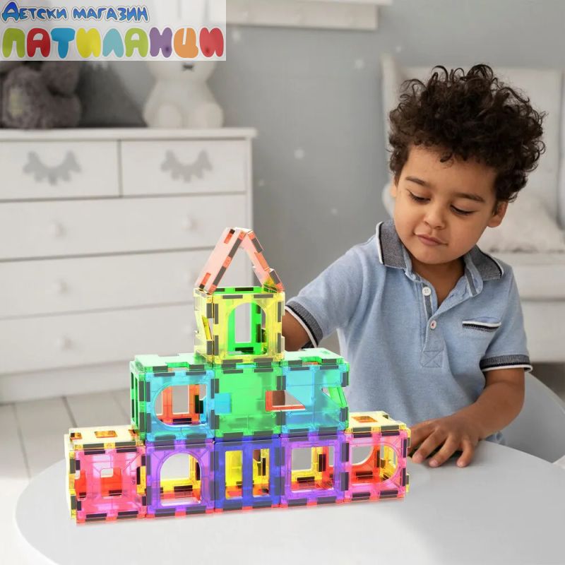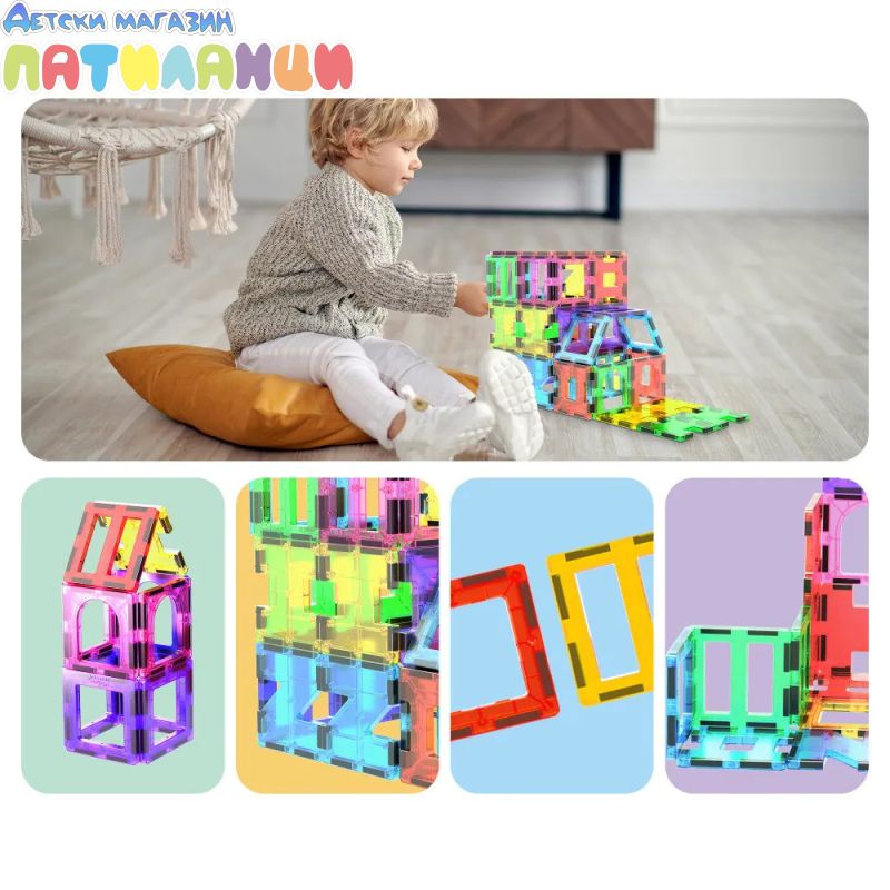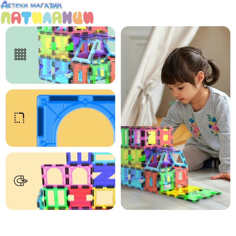 С помощта на цветни магнитни елементи децата могат лесно да създават разнообразни 2D и 3D конструкции, като развиват въображението си и експериментират с форми и цветове. Магнитните плочки се свързват стабилно, което прави сглобяването лесно и забавно.