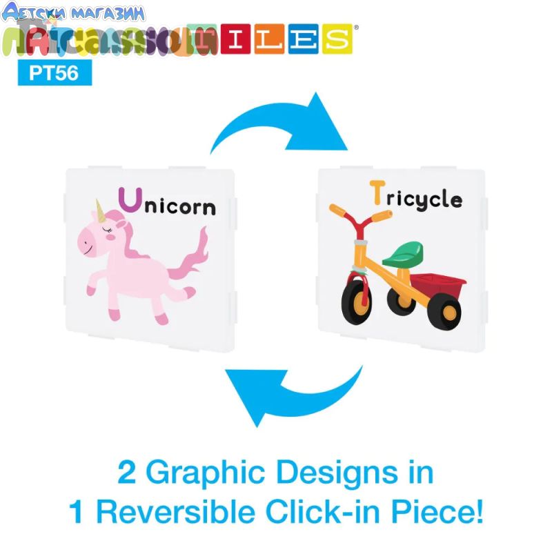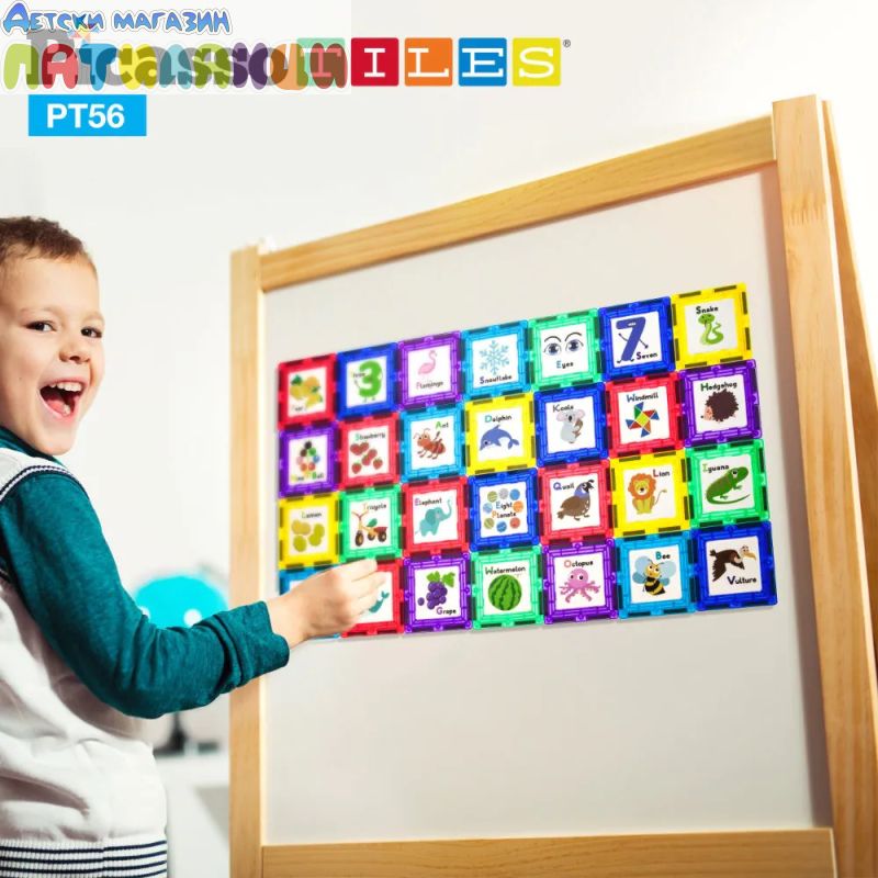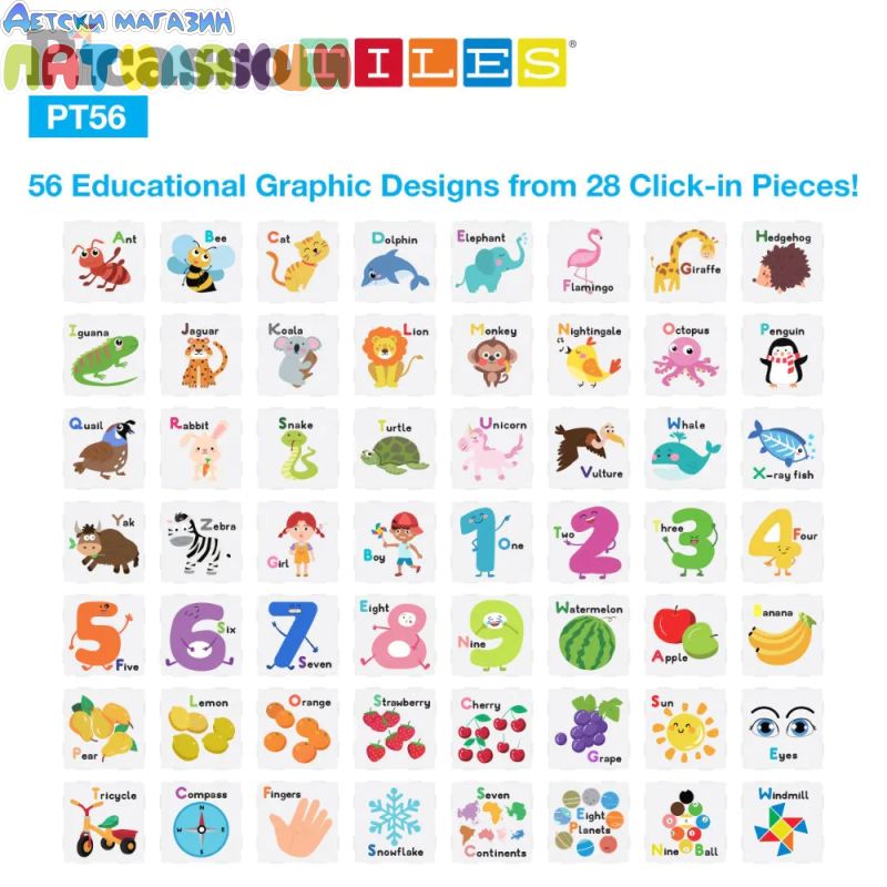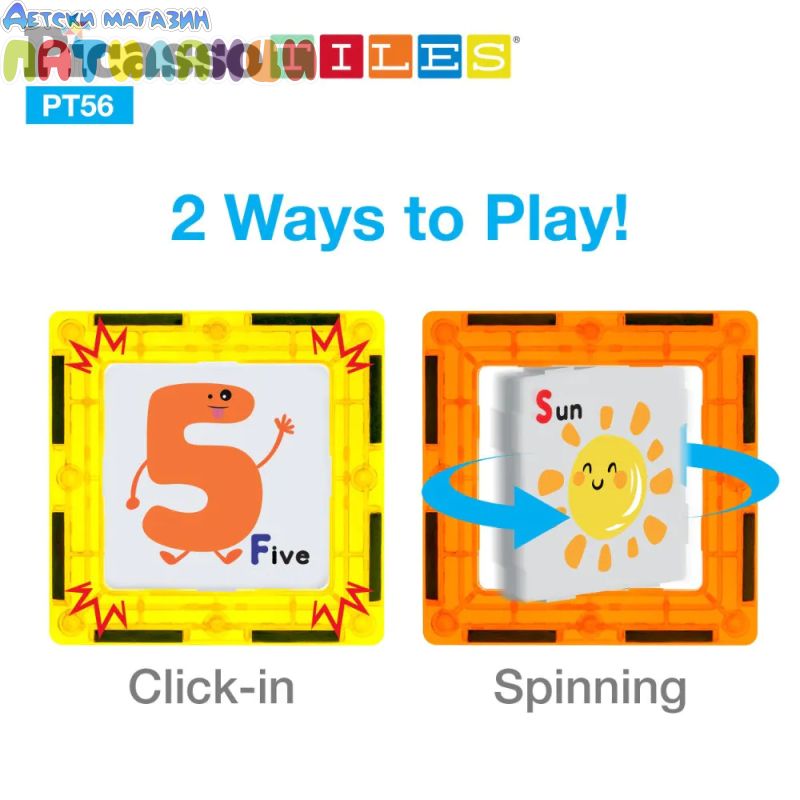 Комплектът съдържа 28 прозрачни плочки и 28 образователни графични вложки с букви, животни, плодове и цифри. Децата могат да поставят вложките в прозрачните плочки или да ги въртят, като по този начин се предлагат два начина на игра, които превръщат ученето в забавно преживяване чрез съчетаване, сглобяване и творческо изследване.