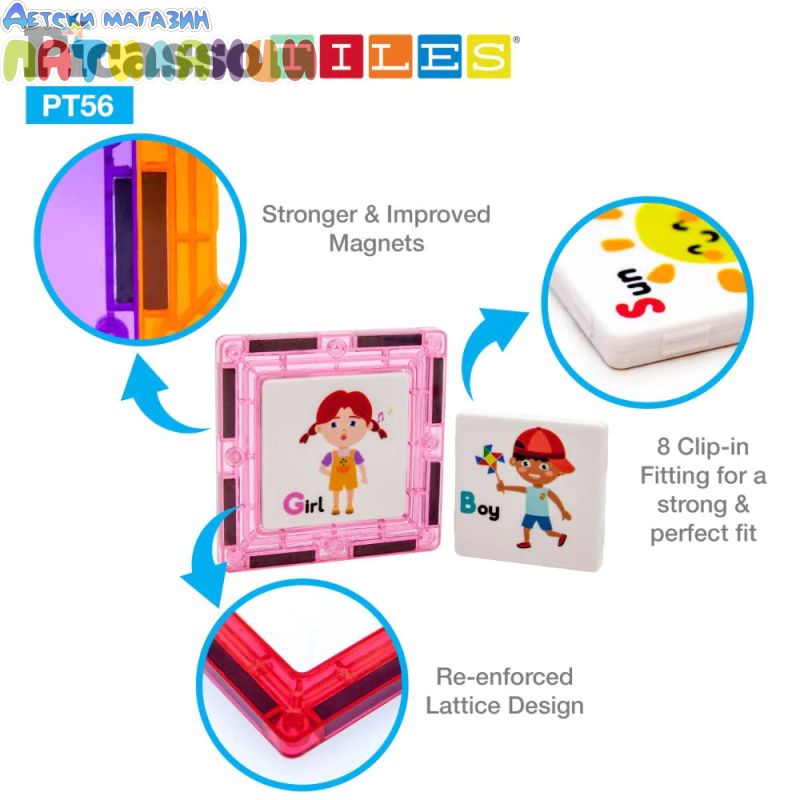 С помощта на цветни магнитни елементи децата могат лесно да създават разнообразни 2D и 3D конструкции – сгради, фигури и въображаеми светове. Магнитите се свързват стабилно и позволяват бързо сглобяване и разглобяване, което прави играта още по-интересна и динамична.