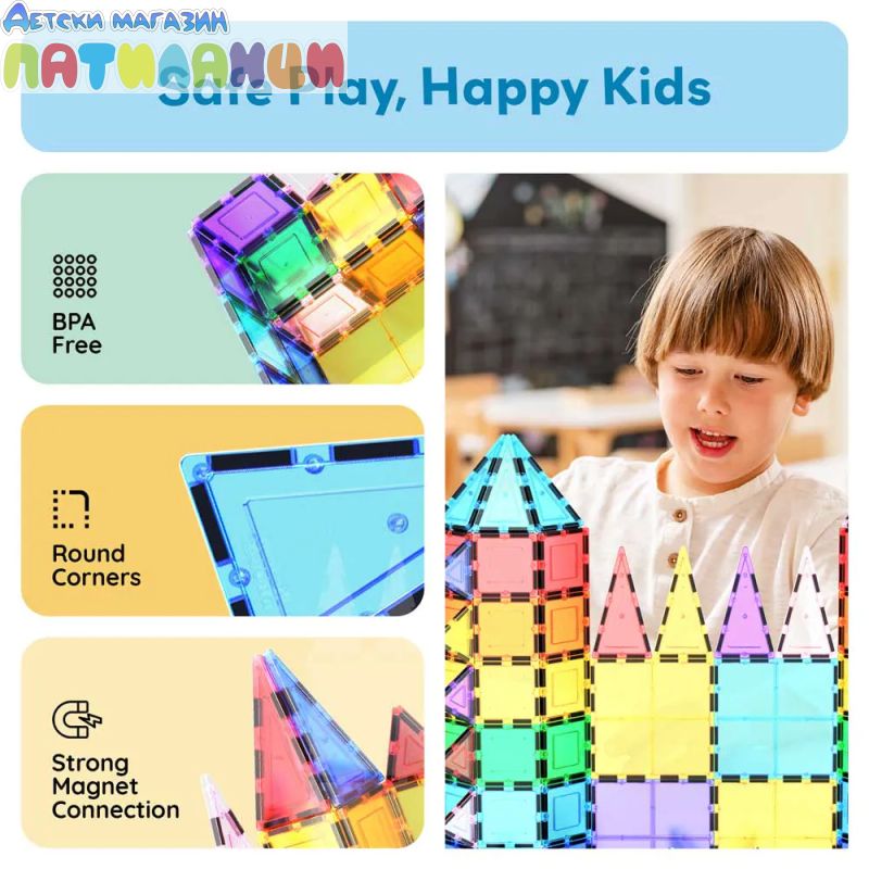 Магнитните плочки се свързват лесно и стабилно, което прави играта интуитивна и подходяща както за самостоятелно, така и за групово забавление.