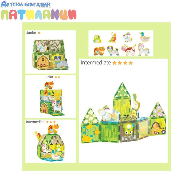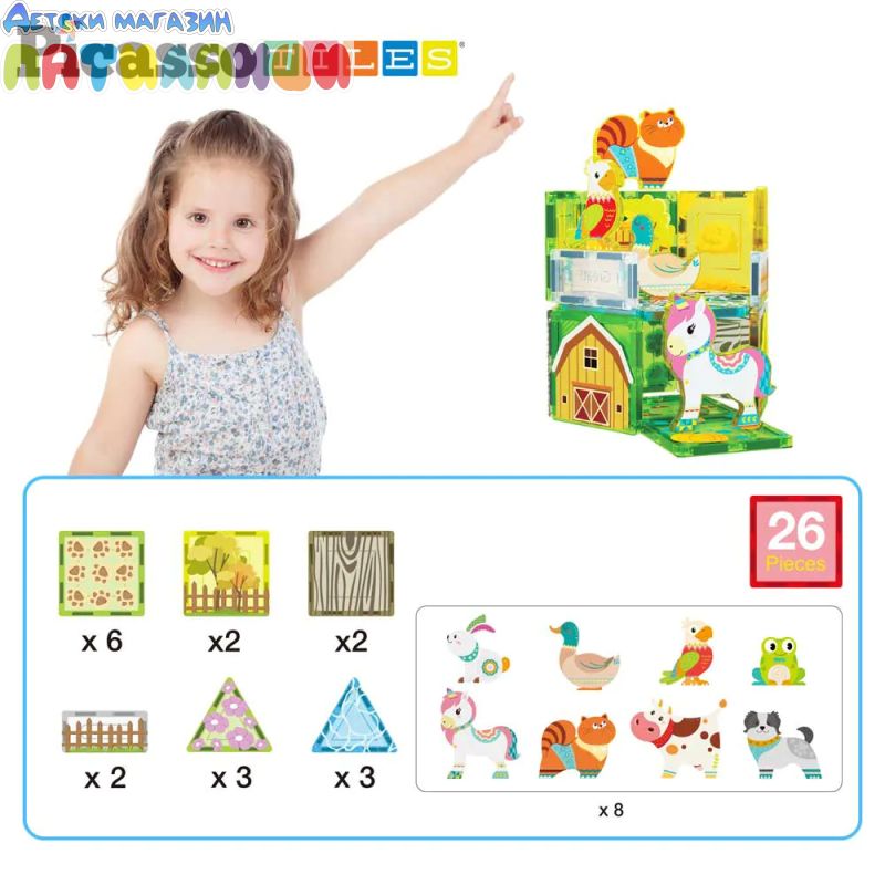 Този тематичен сет включва 26 магнитни части и цели 8 сладки животни – заек, патица, папагал, жаба, еднорог, котка, крава и куче, които правят играта още по-забавна и реалистична