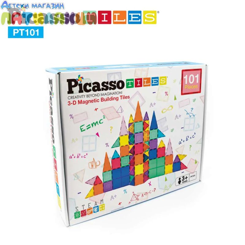 PicassoTiles от 101 части е класически комплект магнитни плочки, който изгражда въображението. Включва цветни квадрати и триъгълници за изграждане на кули, къщи, животни и геометрични фигури. Изследвай съчетаването на цветове, 2D и 3D дизайна, ранните STEM концепции и пространственото мислене чрез креативна игра с магнитни плочки!