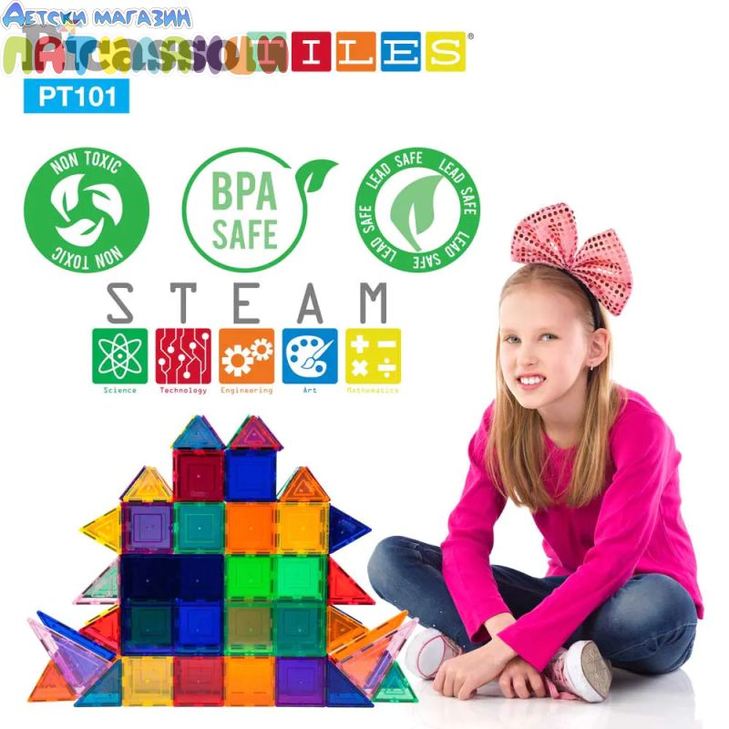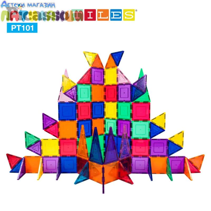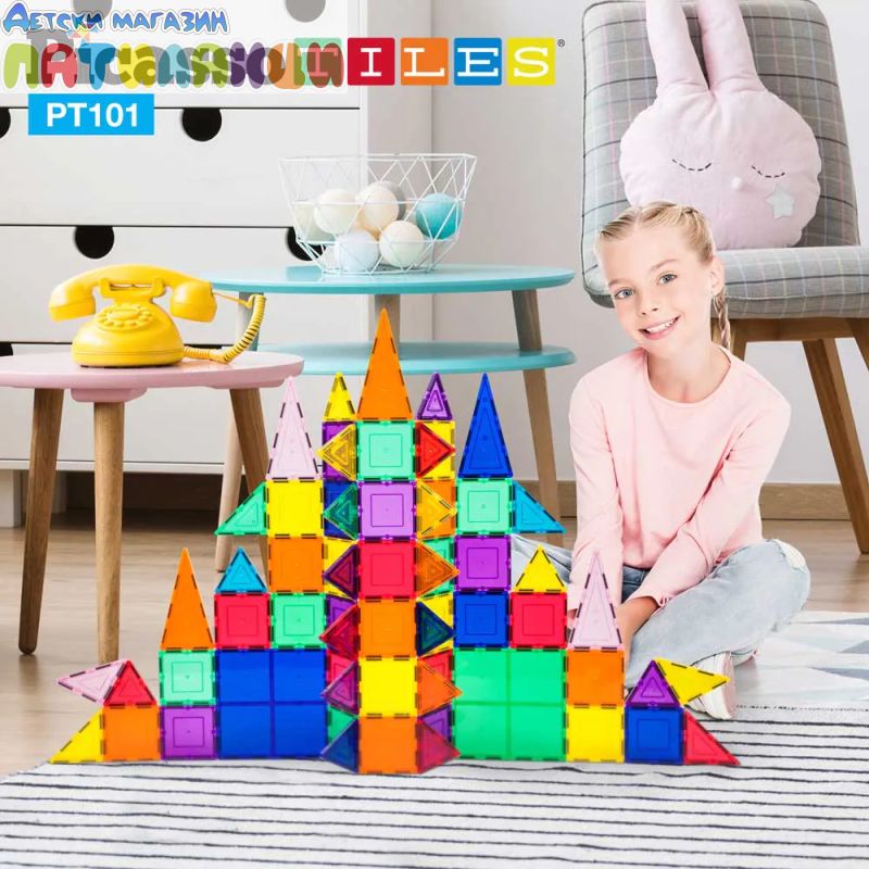 Със своите 101 цветни магнитни елемента, включващи различни видове триъгълници и квадрати, децата могат да създават както прости фигури, така и сложни 3D конструкции – къщи, кули, животни и още много.