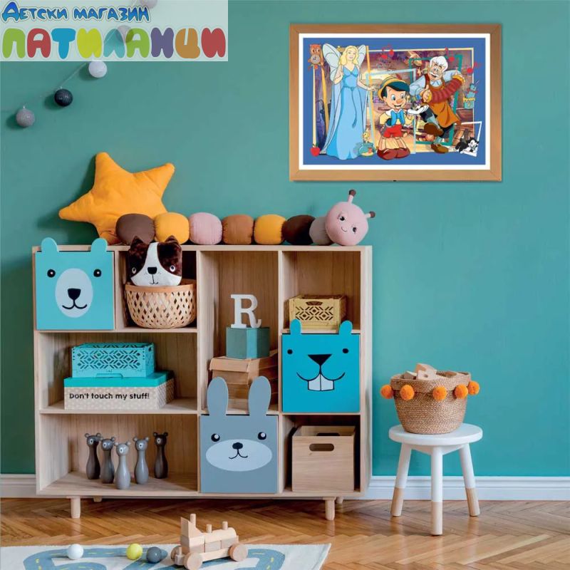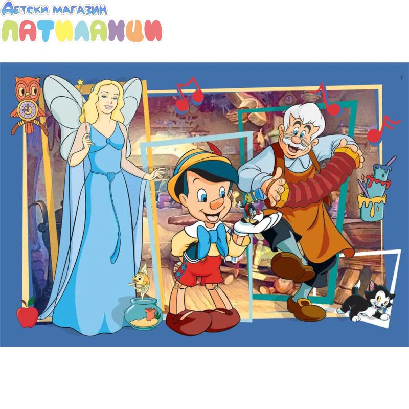 С този пъзел малките ще се срещнат с любимите герои от историята за Пинокио, докато сглобяват цветна и жива сцена. Ярките цветове и качественият печат правят всяка част лесна за разпознаване и превръщат играта в истинско удоволствие.
