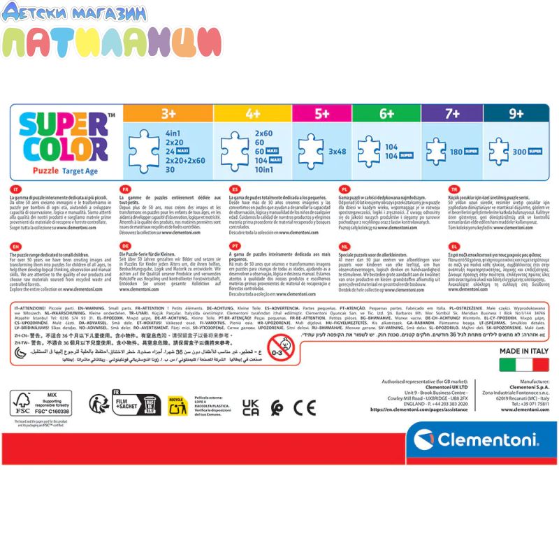 CLEMENTONI Ви предлага най-пълната колекция от пъзели с размери, вариращи от 30 до 42000 парчета и с най-добрите снимки и най-забавните герои.