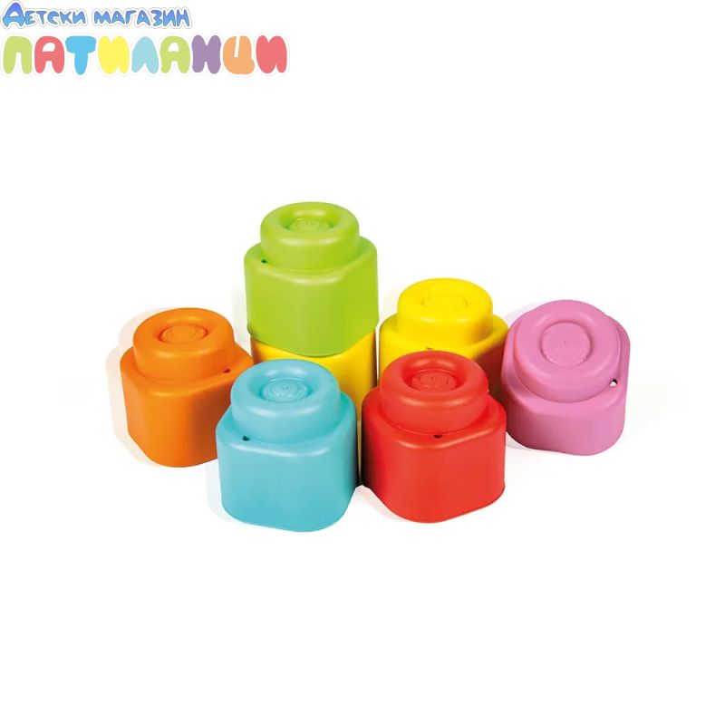 Комплектът включва 6 блокчета и 3 фигурки. Меките блокчета помагат за развитието на ръчните умения и стимулират тактилното възприятие на децата.