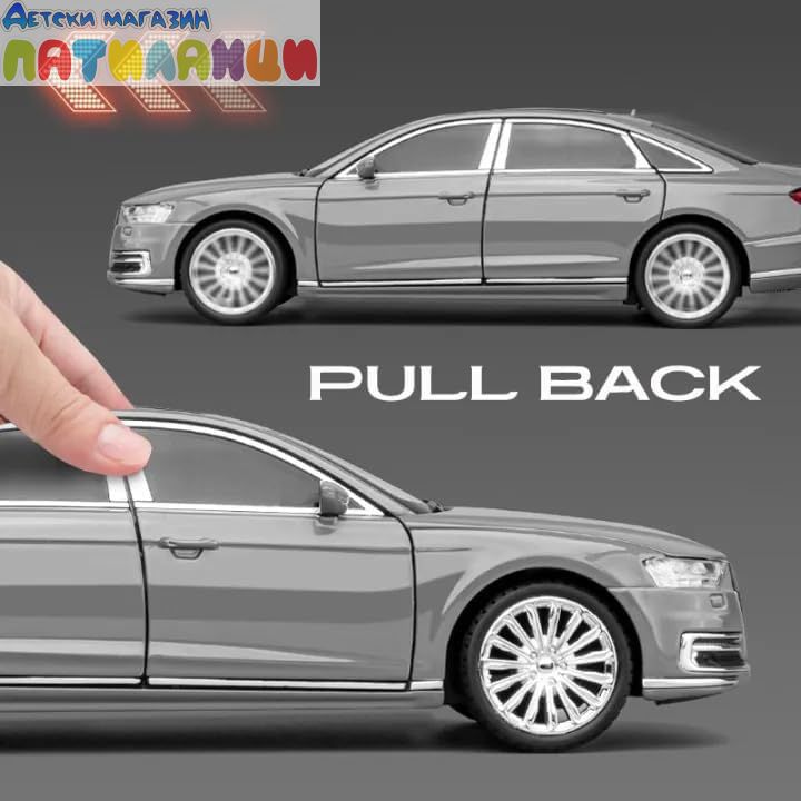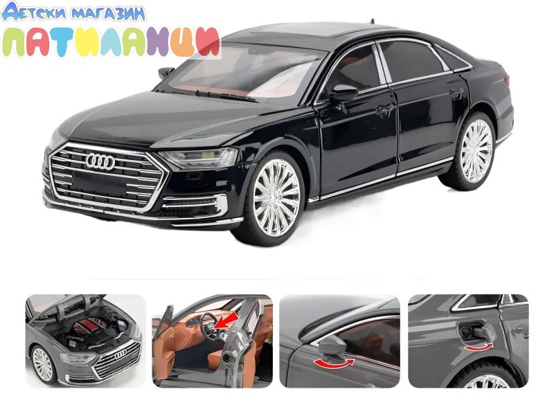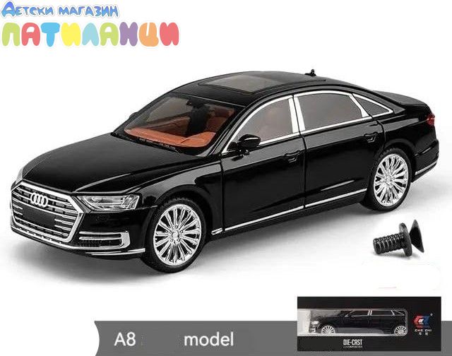Детайлен метален модел Audi A8 в мащаб 1:24 луксозен седан с изчистен дизайн и реалистични детайли.