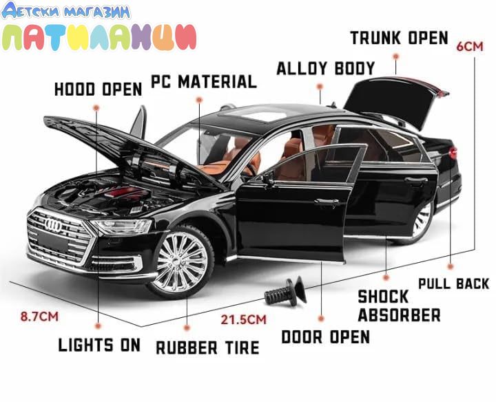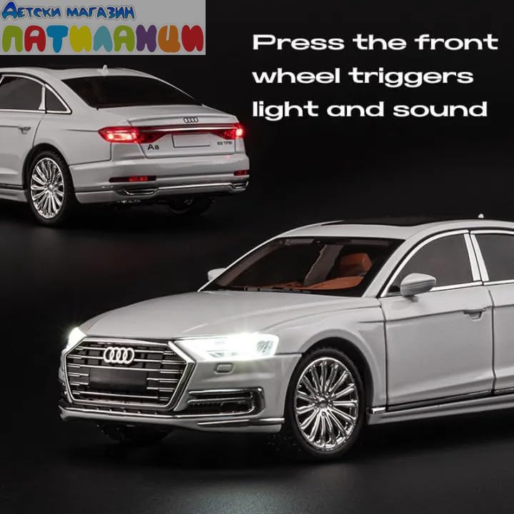 Детайлен метален модел Audi A8 в мащаб 1:24 луксозен седан с изчистен дизайн и реалистични детайли.